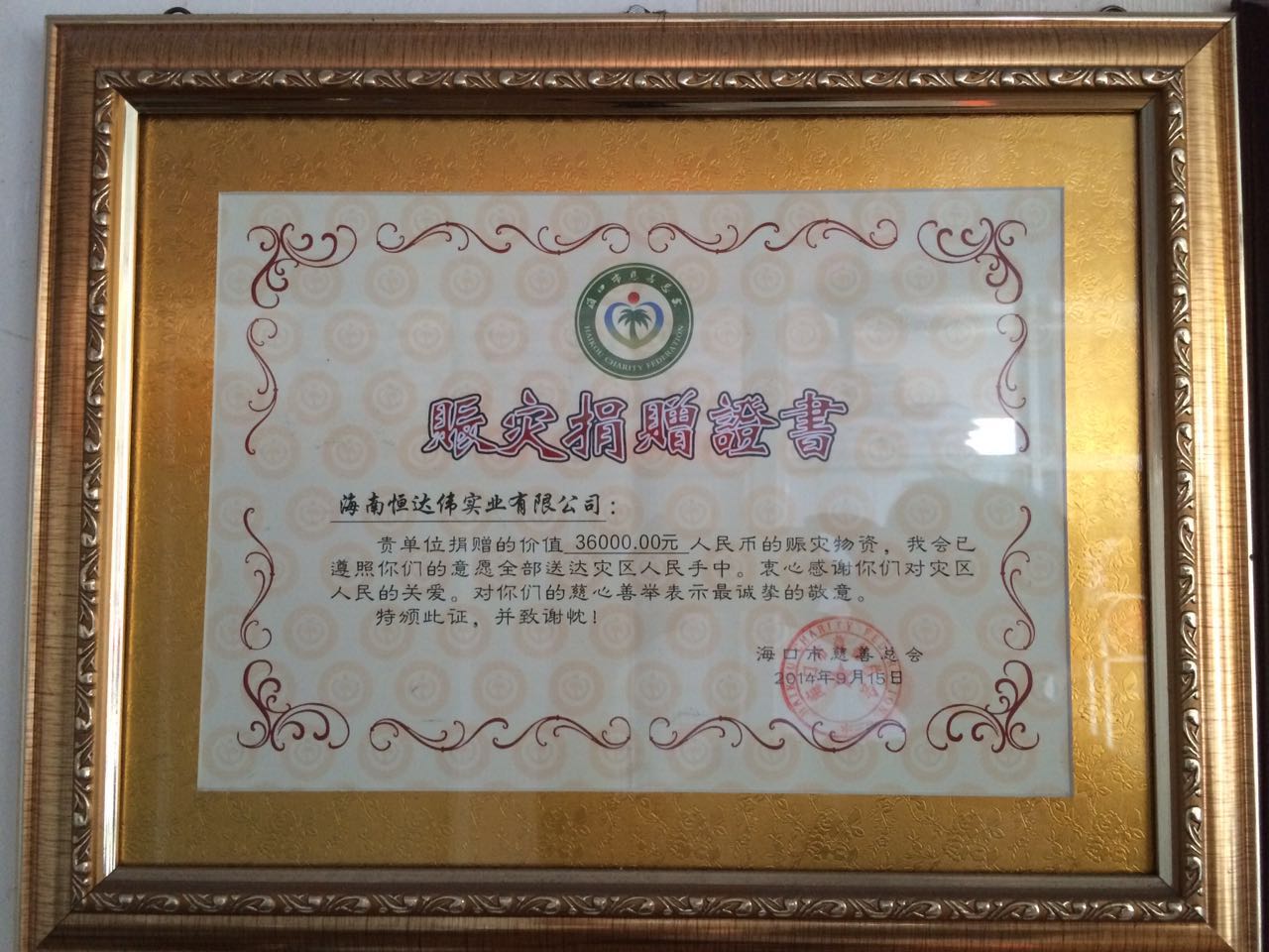 2014年10月5日,海南恒达伟向澄迈县捐赠大米约6吨,价值3万6,积极帮助受台风(台风“威马逊”、“海鸥”)影响的灾区。